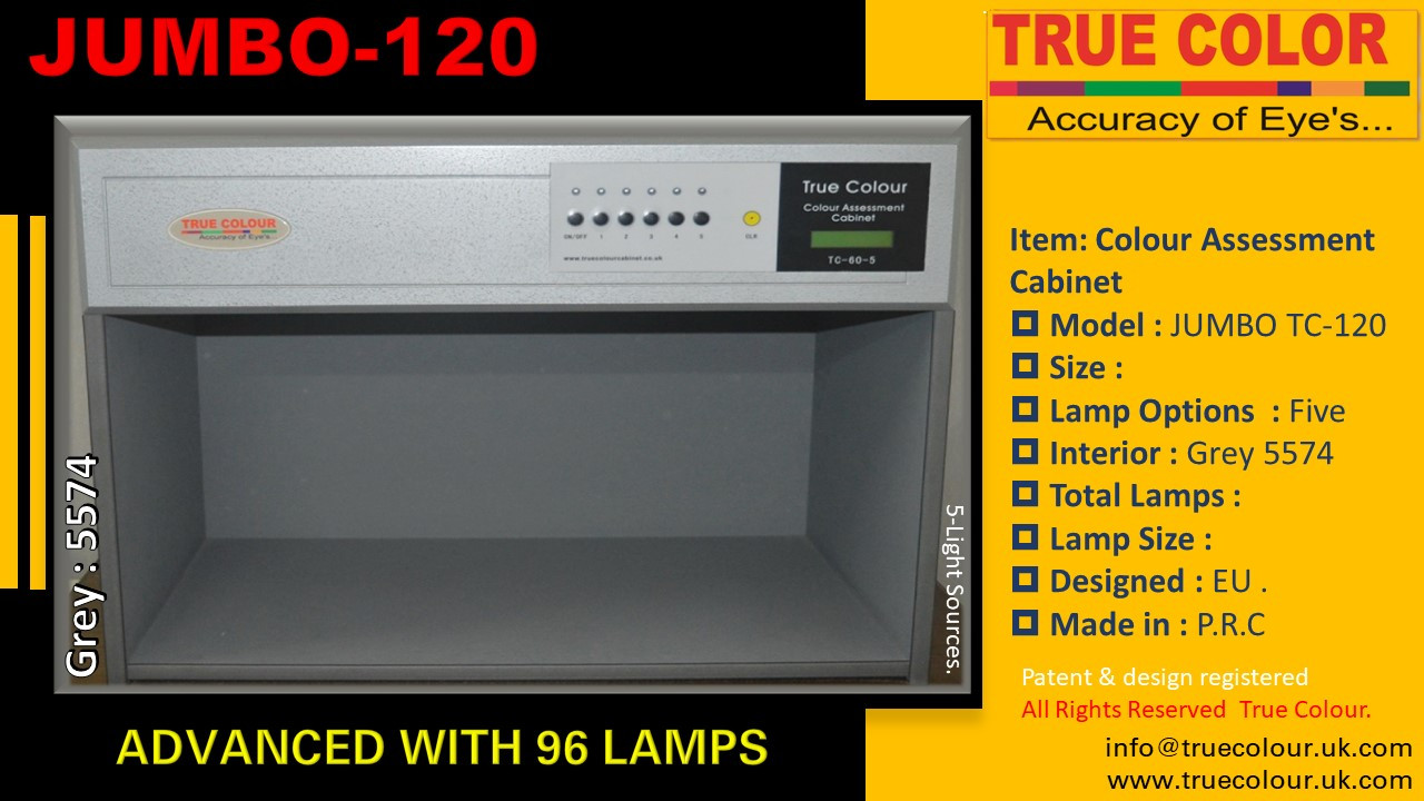 The True Colour- Colour Assessment Cabinet incorporates ""illuminant A"", in accordance with CIE standards. It has been designed to meet the needs of the EU & American market with EU & American retailers and manufacturers often specifying lights. The True Color cabinets TC-60-5 , TC120-5 & TC 120-5 (J) contains five light sources that can include a selection of CIE illuminants, point of sale illuminants, UV, Illuminant A .